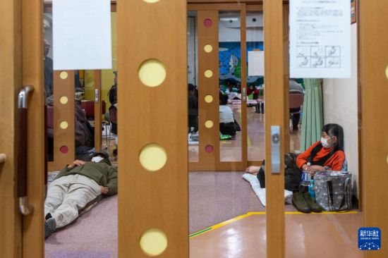 1月3日,在日本石川縣輪島市一處容納超700人的臨時避難所內,人們席地休息。新華社記者 張笑宇 攝