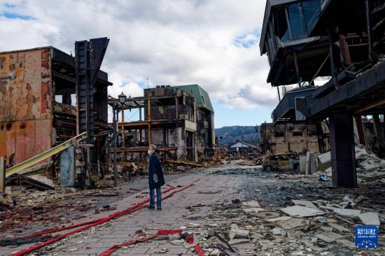 1月4日,一名市民查看日本石川縣輪島市“輪島早市”廢墟。新華社記者 張笑宇 攝