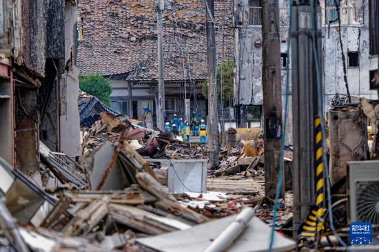 1月4日,警察在日本石川縣輪島市“輪島早市”廢墟中作業。新華社記者 張笑宇 攝