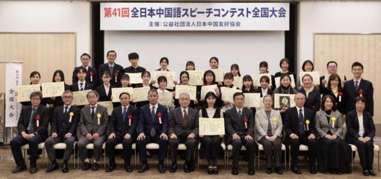 1月7日,第41屆全日本漢語演講比賽合影。(公益社團法人日本中國友好協會供圖)