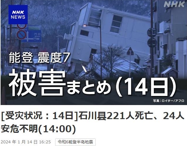 中新網1月14日電 據日本廣播協會(NHK)報道,日本石川縣最新統計數據顯示,截至當地時間14日下午2時,日本石川縣能登地區1日發生的7.6級地震已造成221人遇難。