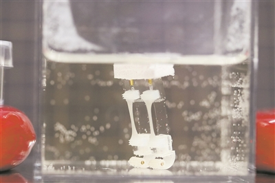 為了建造一個動作更靈活、更精細的機器人,研究人員設計了一種模仿人類步態并在水中操作的生物混合機器人。該機器人有一個泡沫浮標頂部和加重的腿,能幫助它在水下直立。機器人的骨架主要由硅橡膠制成,可彎曲以適應肌肉的運動。然后,研究人員將實驗室培養的骨骼肌組織條連接到硅橡膠和兩條腿上。