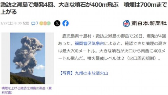 福岡管區氣象臺稱,噴發形成的煙柱最高達700米,巨大火山石從火山口向外飛出400米,當地已經將噴發警戒級別設定為2級,火山口附近禁止入內。
