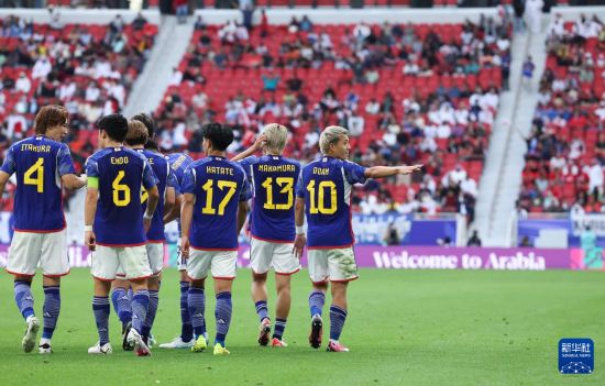 1月31日,日本隊球員堂安律(右一)進球后與隊友慶祝。新華社記者 丁汀 攝