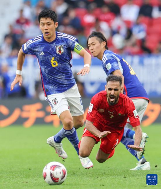 1月31日,日本隊球員遠藤航(左一)與巴林隊球員阿里·馬丹(中)拼搶。新華社記者 丁汀 攝