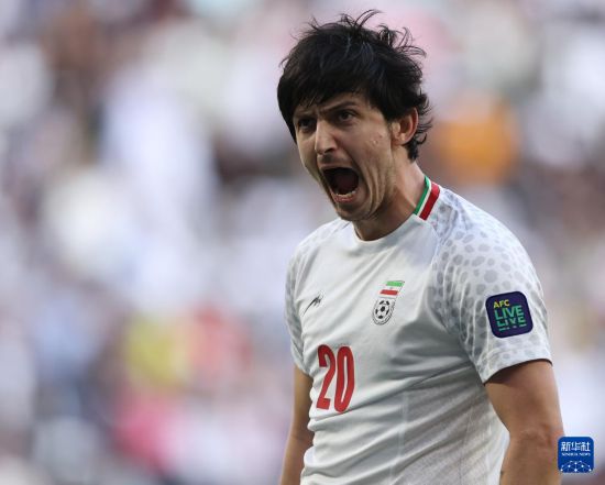 ??2月3日,伊朗隊球員薩爾達·阿茲蒙在比賽中慶祝隊友穆罕默德·莫赫比的進球。新華社記者 賈浩成 攝