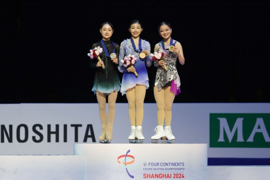 2月2日,冠軍日本選手千葉百音(中)、亞軍韓國選手金彩然(左)、季軍日本選手渡邊倫果在女子單人滑頒獎儀式上合影。新華社記者 王翔 攝