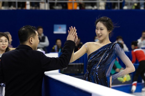 2月2日,中國選手陳虹伊(右)在自由滑比賽后和教練擊掌。最終,她位列女子單人滑第13。新華社記者 王翔 攝