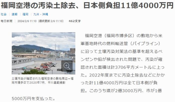 據報道,福岡機場所在地曾為美軍基地,1972年返還給日方,污染區域基本都是當年美軍基地的燃料輸送管沿線。
