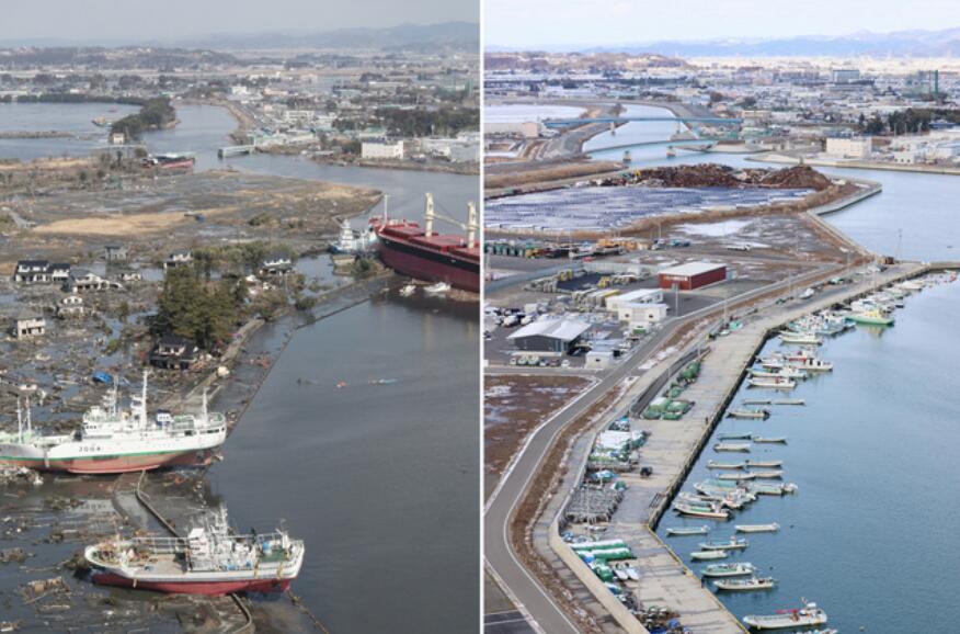 左圖為東日本大地震發生第二天的2011年3月12日拍攝的宮城縣東松島市大曲地區。右圖為現在的東松島市大曲地區。(圖片來源:《朝日新聞》)