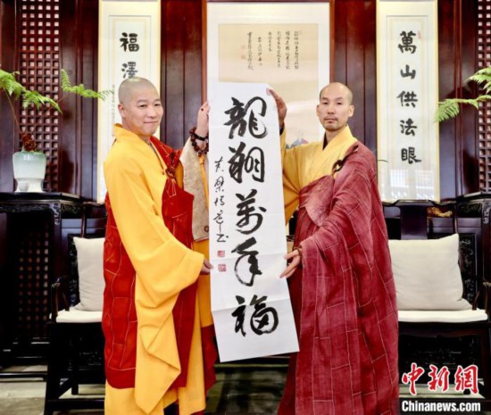 圖為日本黃檗宗宗務總長荒木將旭向福建黃檗山萬福寺住持定明法師贈送禮物。黃檗書院 供圖