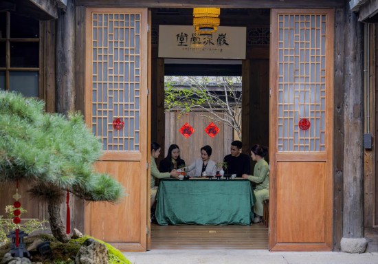 在福建師范大學學中文的日本留學生平山義晃(右二)3月7日在福州市上下杭街區體驗福建功夫茶。新華社記者魏培全攝