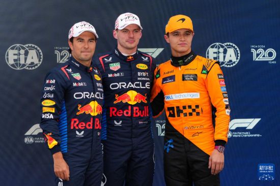4月6日,紅牛車隊荷蘭車手維斯塔潘(中),隊友墨西哥車手佩雷茲(左)和邁凱倫車隊英國車手諾里斯在排位賽后合影。新華社記者 張笑宇 攝