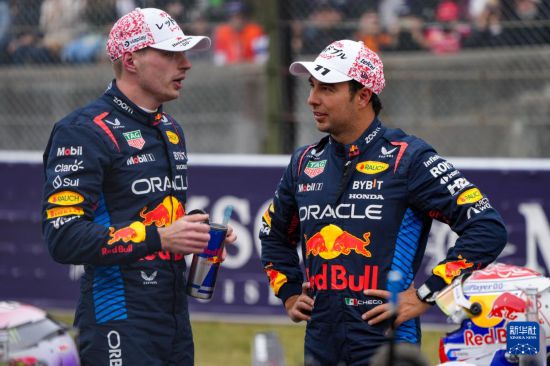 4月6日,紅牛車隊荷蘭車手維斯塔潘(左)和隊友墨西哥車手佩雷茲在排位賽后交流。新華社記者 張笑宇 攝