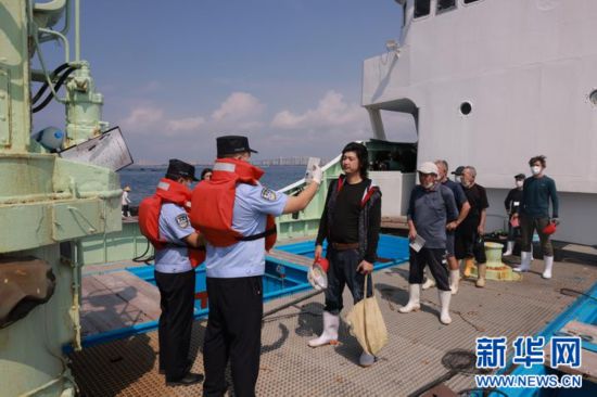 4月15日,三亞邊檢站移民管理警察正在對船員進行人證對照。叢高 攝