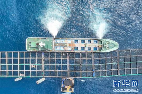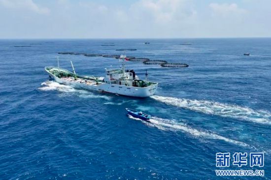 4月15日,完成裝載作業的“第六十一若宮丸”號日本籍魚苗船緩緩駛離海南陵水新村港外錨地前往日本鹿兒島(無人機照片)。