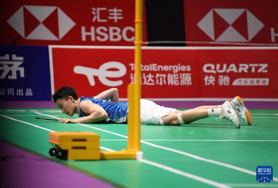 ??4月28日,日本隊選手桃田賢斗在男單比賽中倒地。他2比0戰勝捷克隊選手科普日瓦。新華社記者 侯昭康 攝