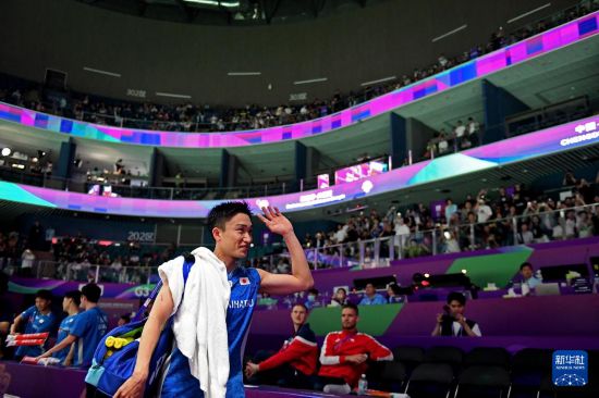 ??4月28日,日本隊選手桃田賢斗在男單比賽后向球迷致謝。他2比0戰勝捷克隊選手科普日瓦。新華社記者 侯昭康 攝