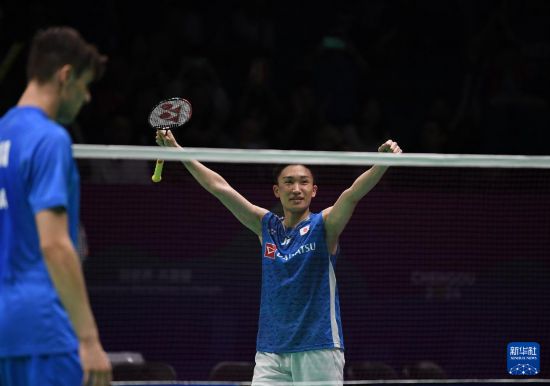 ??4月28日,日本隊選手桃田賢斗(右)在男單比賽后慶祝勝利。他2比0戰勝捷克隊選手科普日瓦。新華社記者 侯昭康 攝