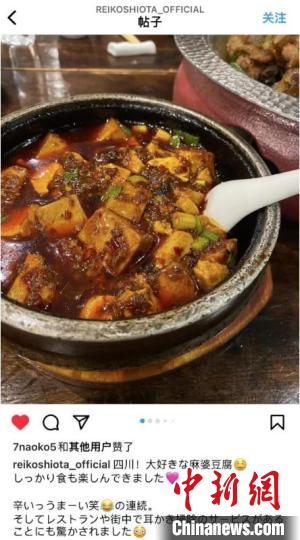 潮田玲子在社交媒體上稱自己吃到了麻婆豆腐。(圖/潮田玲子Instagram賬號截圖)