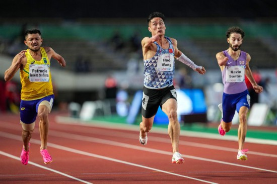 5月17日,中國選手王浩(中)在男子100米T47決賽中以10秒878的成績獲得季軍。新華社記者 張笑宇 攝