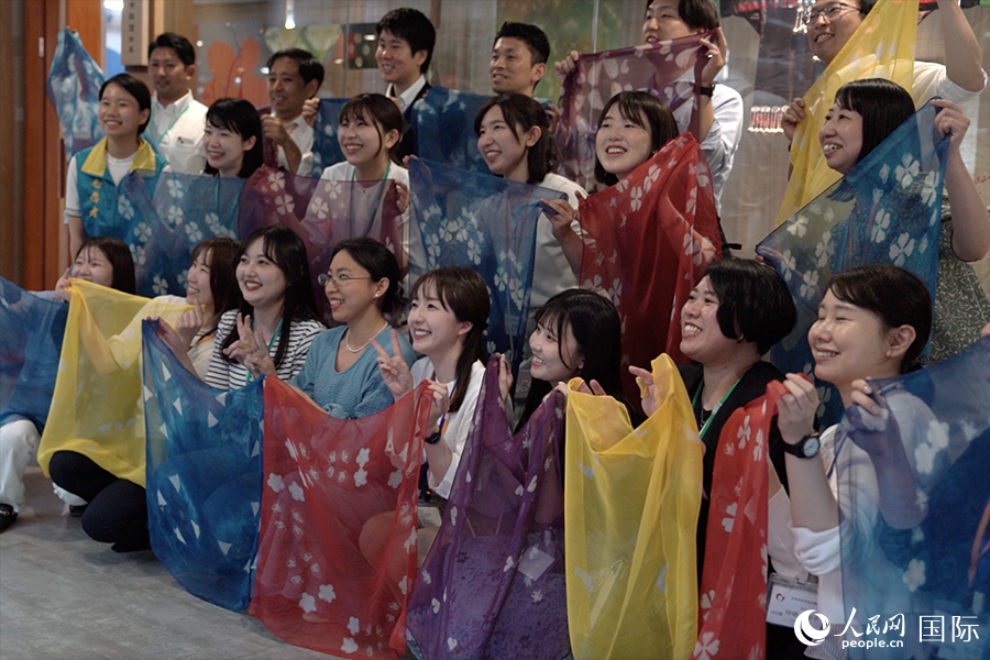 日本創價學會青年代表團成員體展示扎染作品。人民網記者 張麗婭攝