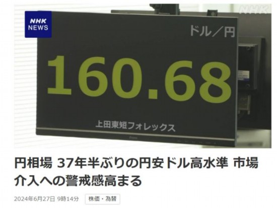 中新網6月27日電 據日本廣播協會(NHK)報道,東京外匯市場27日的數據顯示,日元對美元的匯率跌破161日元兌換1美元,已跌至約37年半以來的最低值。