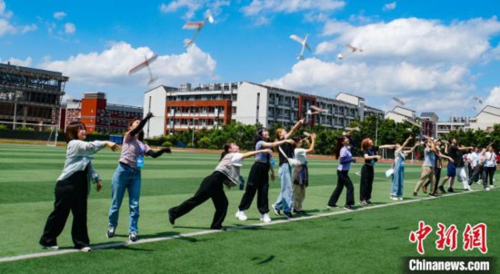7月22日,日本青少年在桂林航天工業學院學生指導下放飛自制的橡皮筋飛機!∈Y豐慧 攝