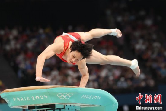 7月29日,巴黎奧運會體操男子團體決賽在貝爾西體育館舉行,中國隊獲得銀牌。圖為中國隊選手蘇煒德在跳馬比賽中。 中新社記者 盛佳鵬 攝