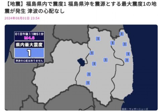 中新網8月2日電 據日本福島電視臺報道,當地時間8月1日23時51分許,日本福島縣近海發生4.6級地震。