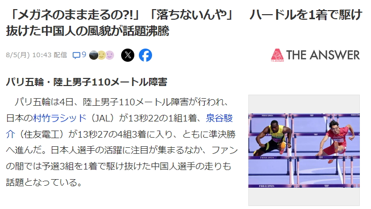 海外網8月5日電 據日媒《The Answer》8月5日報道,4日,巴黎奧運會田徑男子110米欄第一輪比賽舉行,盡管有日本選手晉級,但以排名第一晉級的中國選手徐卓一成為了日本社交媒體熱搜話題。