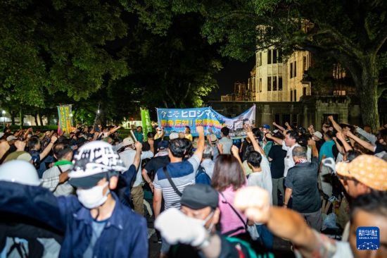 8月5日晚,民眾在日本廣島和平紀念公園舉行抗議集會。新華社記者 張笑宇 攝