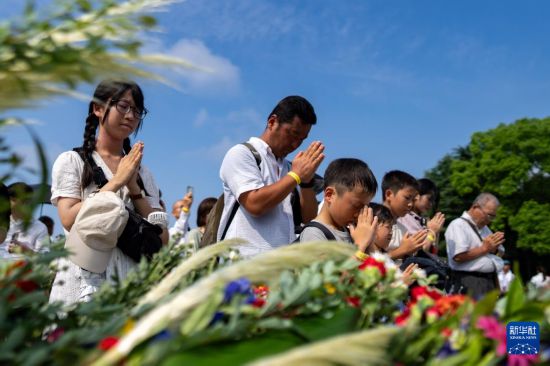 8月6日,在日本廣島舉行的遭原子彈轟炸79周年紀念儀式后,人們排隊獻花,紀念原子彈轟炸受害者。新華社記者 張笑宇 攝
