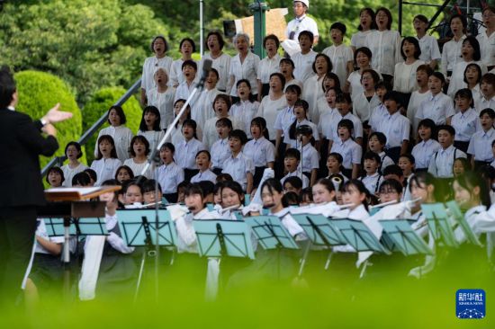 8月6日,在日本廣島舉行的遭原子彈轟炸79周年紀念儀式上,合唱團唱歌紀念原子彈轟炸受害者。新華社記者 張笑宇 攝