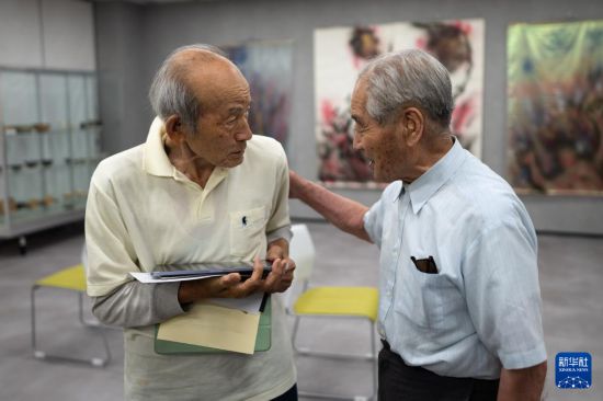 8月10日,在日本長野縣飯田市和平祈念館舉行的第35次“為了和平的信州戰爭展”上,清水英男(右)與日本民間和平團體“為了和平的信州戰爭展實行委員會”前會長久保田昇交談。新華社記者 張笑宇 攝
