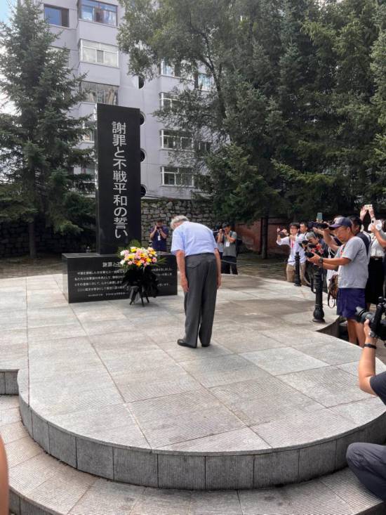圖為清水英男來到“謝罪與不戰和平之碑”處懺悔謝罪