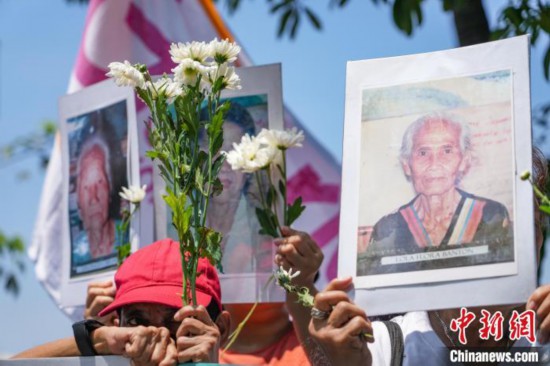 當地時間8月14日,菲律賓“慰安婦”權益保護組織——“菲律賓祖母聯盟”成員與部分“慰安婦”受害者家屬在馬尼拉舉行游行示威。圖為家屬們手舉白色菊花,靜默緬懷已逝的親人。中新社記者 張興龍 攝