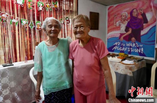 2023年12月22日,菲律賓“慰安婦”幸存者埃斯特莉塔(右)和娜西薩在馬尼拉參加一場聚會。(資料圖)中新社記者 張興龍 攝