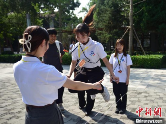 日本青少年交流團來到山西大學參訪,學習中國流行的民間游戲“跳皮筋”。南嘉豪 攝