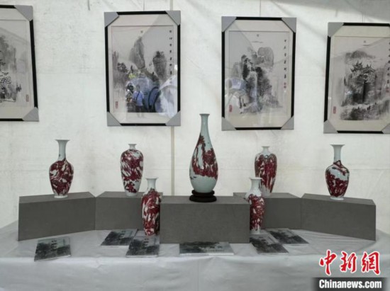 “2024中國節”期間,陶瓷大師葉建新的釉里紅作品及中國畫引人注目。(博覽院供圖)