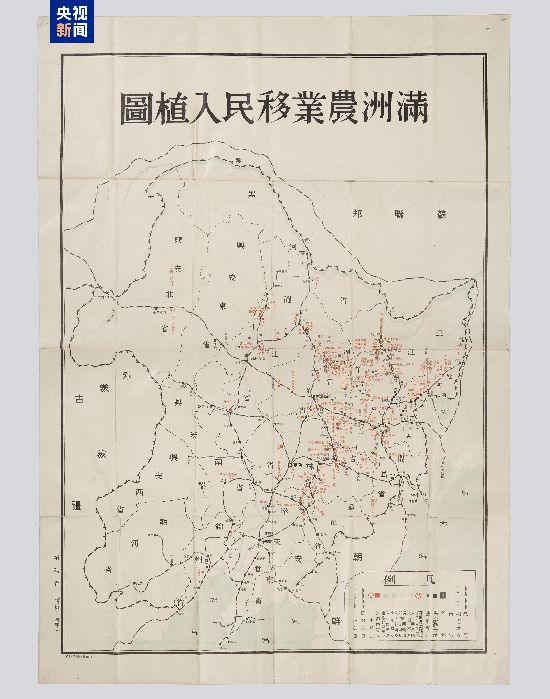 據東北烈士紀念館工作人員介紹,“滿洲農業移民入植圖”是日本昭和14年(1939年)由日本拓務省出版,日本杉田屋印刷所印刷。用100克凸版紙,紅、黑、淺藍三色膠版印刷,縱76厘米,橫54厘米,保存完好。從圖上可以清楚地看到日本帝國主義侵占我國東北后,有計劃、有組織地大規模向中國東北移民的詳盡情況。這是迄今少有的一份有關日本侵略中國進行移民的實物資料,也是日本妄圖長期占領中國東北的歷史物證。