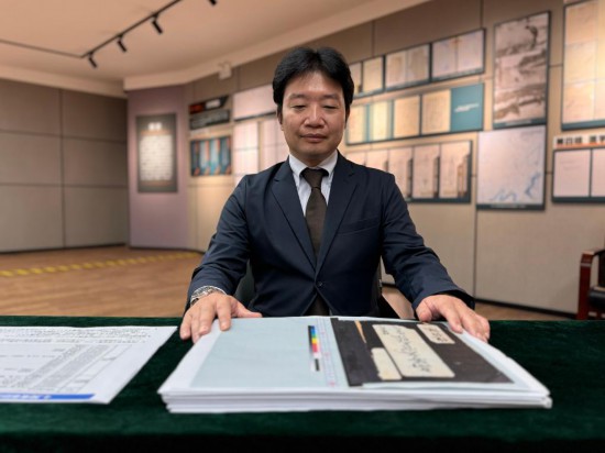 在侵華日軍第七三一部隊罪證陳列館新聞中心,日本學者、黑龍江外國語學院特聘教授松野誠也展示《陸軍高等文官名簿 陸軍書記官 陸軍技師》影印件資料(9月17日攝)。新華社記者 楊思琪 攝
