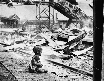 1937年8月28日,日軍轟炸上海南站,鐵軌邊一個滿身是血的幼兒嚎啕大哭。王小亭攝(影像中國)