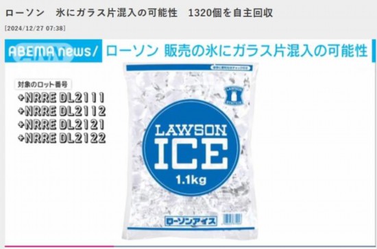 據報道,受影響的是東京、埼玉、山梨部分地區的羅森商店,涉及的產品在當地時間25日0時至26日16時之間售出,產品名稱為“羅森冰1.1公斤”。