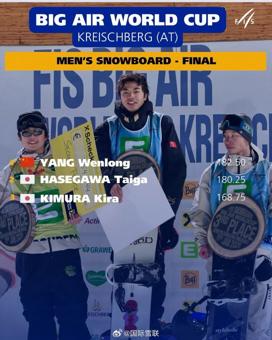 決賽前兩輪,楊文龍穩穩完成兩個方向1800,動作質量上乘。最后一輪,沖擊冠軍的他嘗試Backside 1980 Japan成功,得到96.50分的全場最高分數,從而反超長谷川帝勝,最終以182.50分收獲生涯首個世界杯冠軍。
