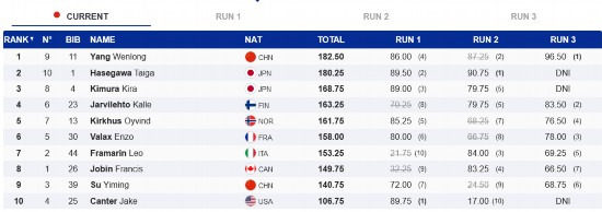 兩位日本選手長谷川帝勝與木村葵來分列第二名與第三名。帶傷出戰的另一位中國選手蘇翊鳴躋身決賽,最終以140.75分獲得第九名。