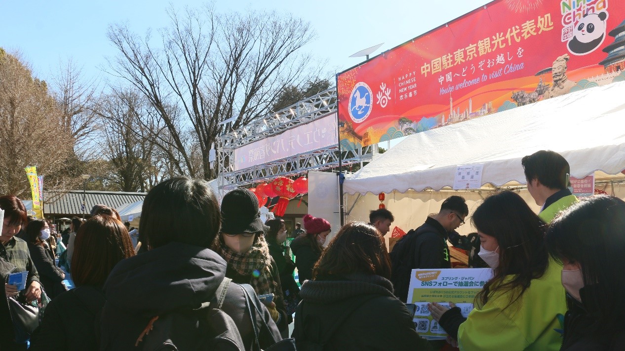中國駐東京旅游辦事處展位前排起長龍。人民網 許可攝