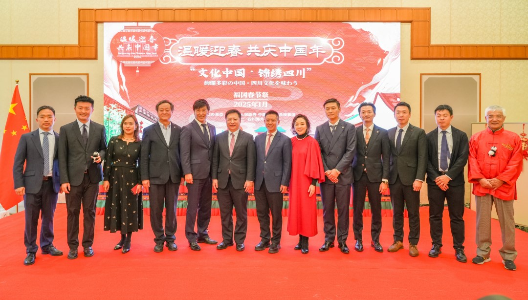 人民網東京2月3日電(許可)2025年福岡春節祭暨“文化中國·錦繡四川”新春招待會日前在中國駐福岡總領事館舉辦。中國駐福岡總領事館代總領事成巖、四川海外聯誼會副會長張榮、福岡縣日中友好協會會長森山沾一等嘉賓出席并致辭。領區各界、主要僑團、留學生、中資企業人員、日本友人等130余人匯聚一堂,共慶佳節。