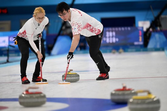 2月8日,日本隊選手小穴桃里/青木豪(右)在比賽中。新華社記者 黃博涵 攝