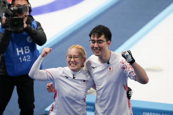 2月8日,日本隊選手小穴桃里/青木豪(右)奪冠后慶祝。新華社記者 胡星宇 攝